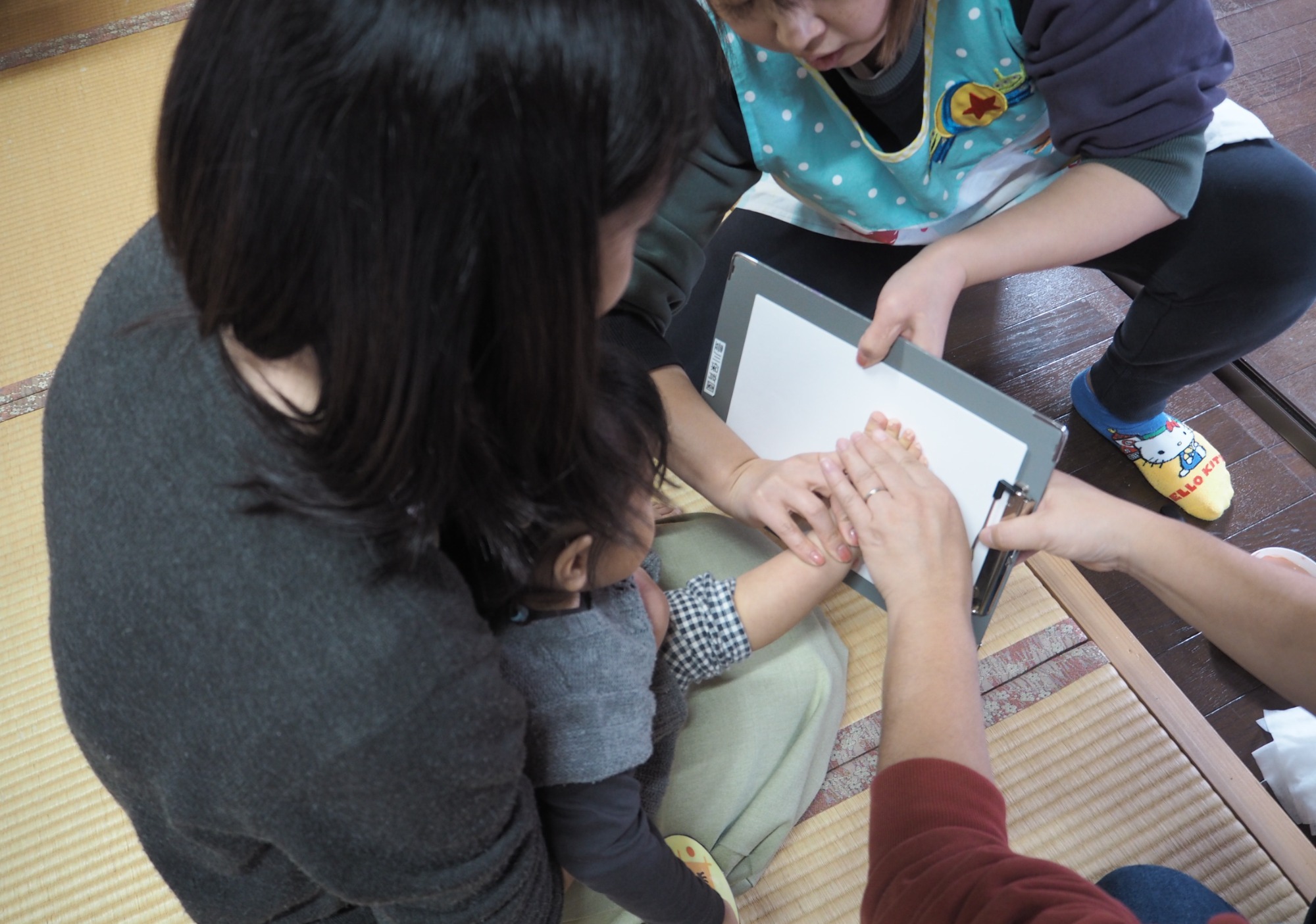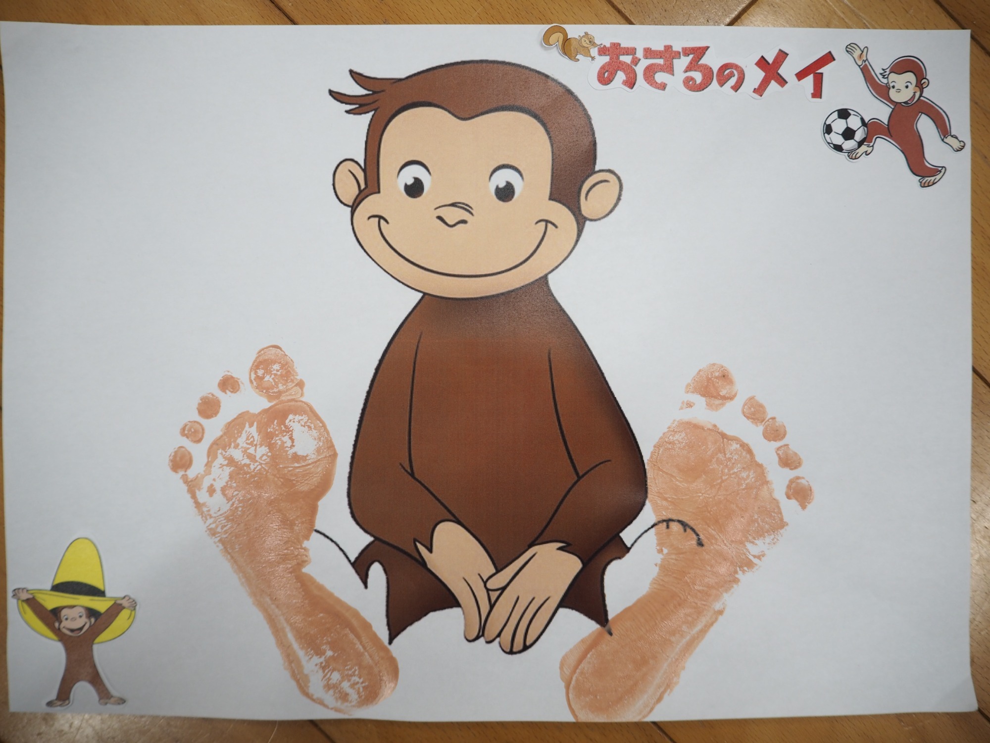 足形アート・・・今月は「おさるのジョージ」の足形アートを行いました。初めて参加するお友だちも増えてきて、足に絵具を塗ると不思議そうな顔をしているお友だちです