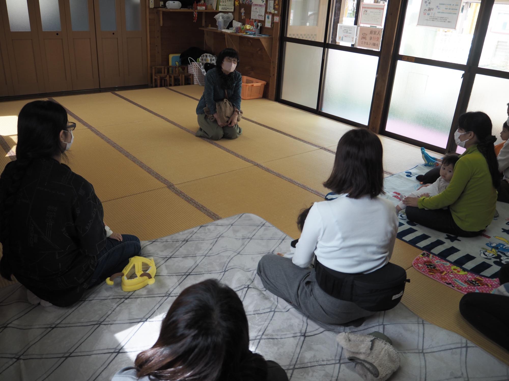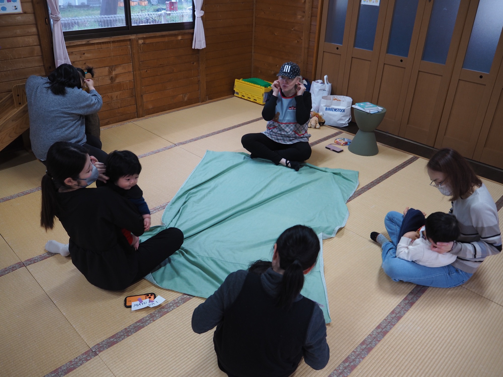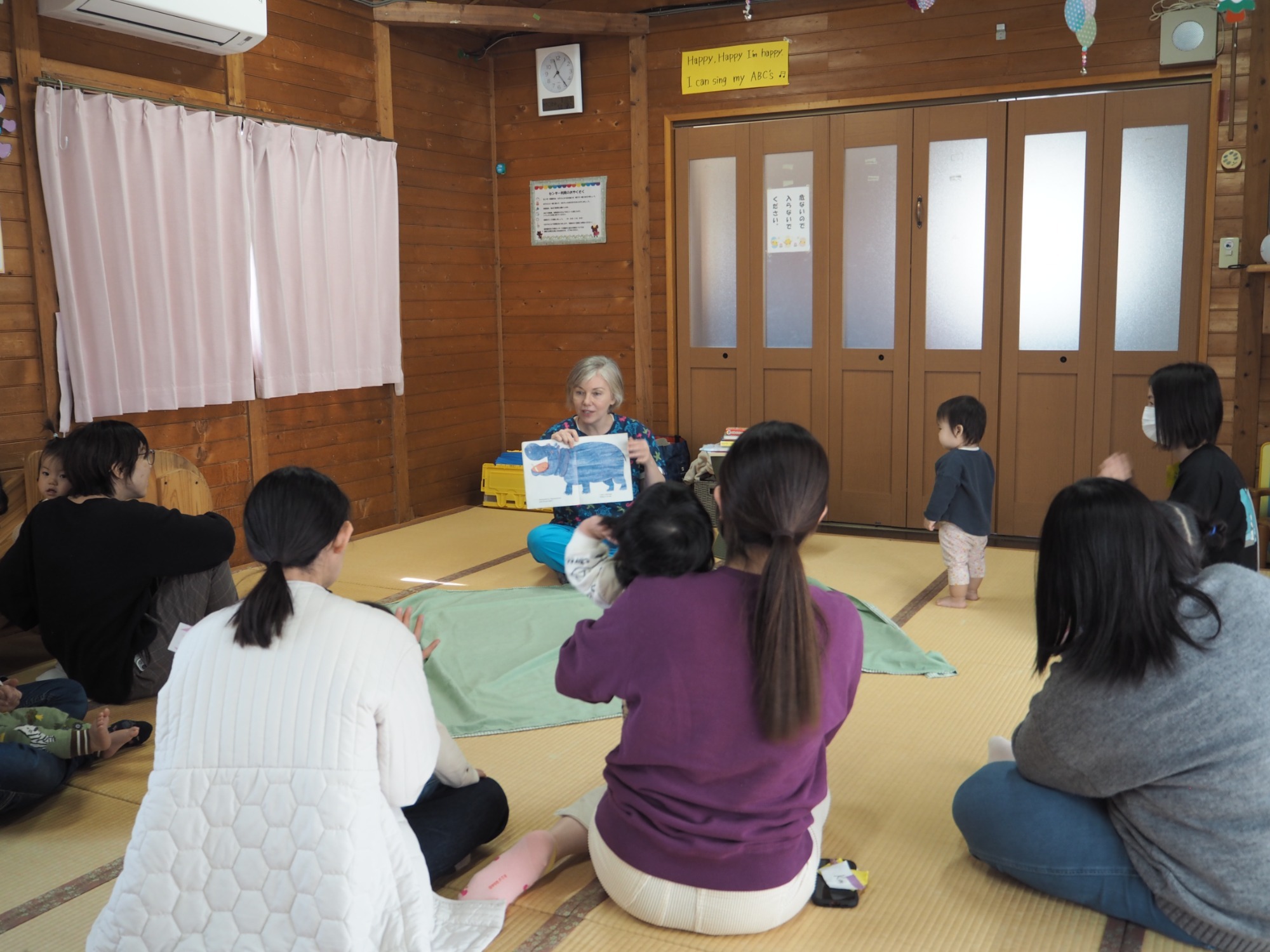 ベビーイングリッシュ・・・今月は「指の名前や動物の鳴き声」をテーマに英語を教えてもらいました。歌に合わせて子どもさんの体に触れたりし、楽しい時間を過ごしました。