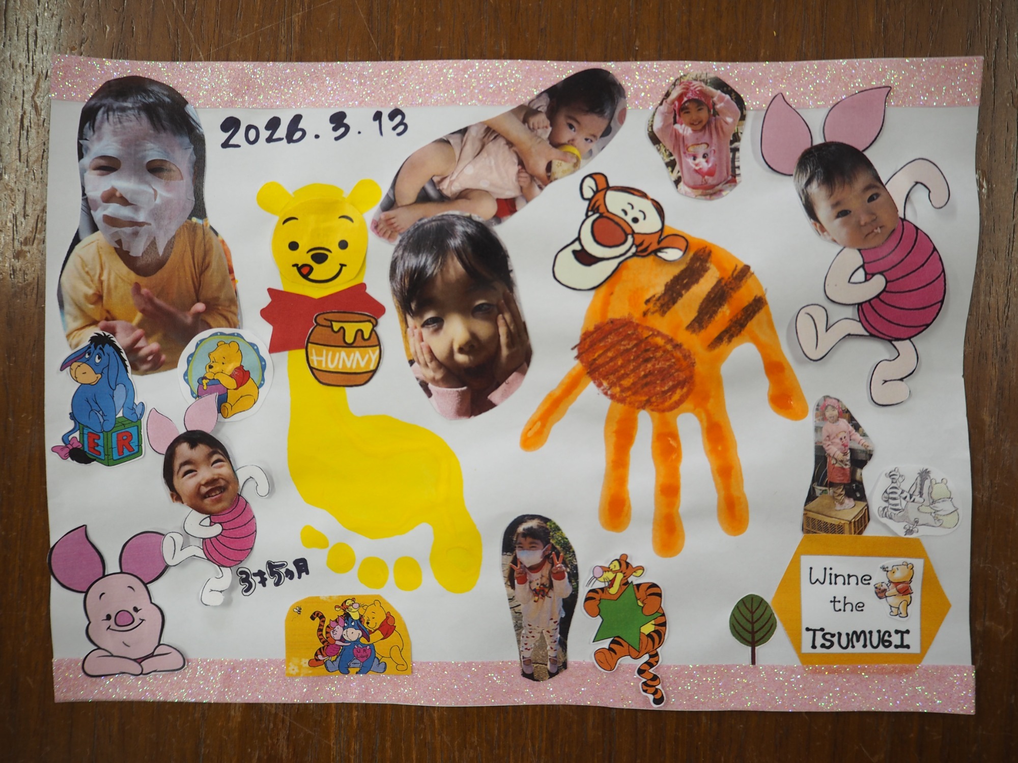 足形アート・・・今月は「くまのプーさん」をテーマに手形・足形をとりました。初めて手形にチャレンジするお友だちもいましたが、泣きながらも記念に残る1枚が出来上がりました。
