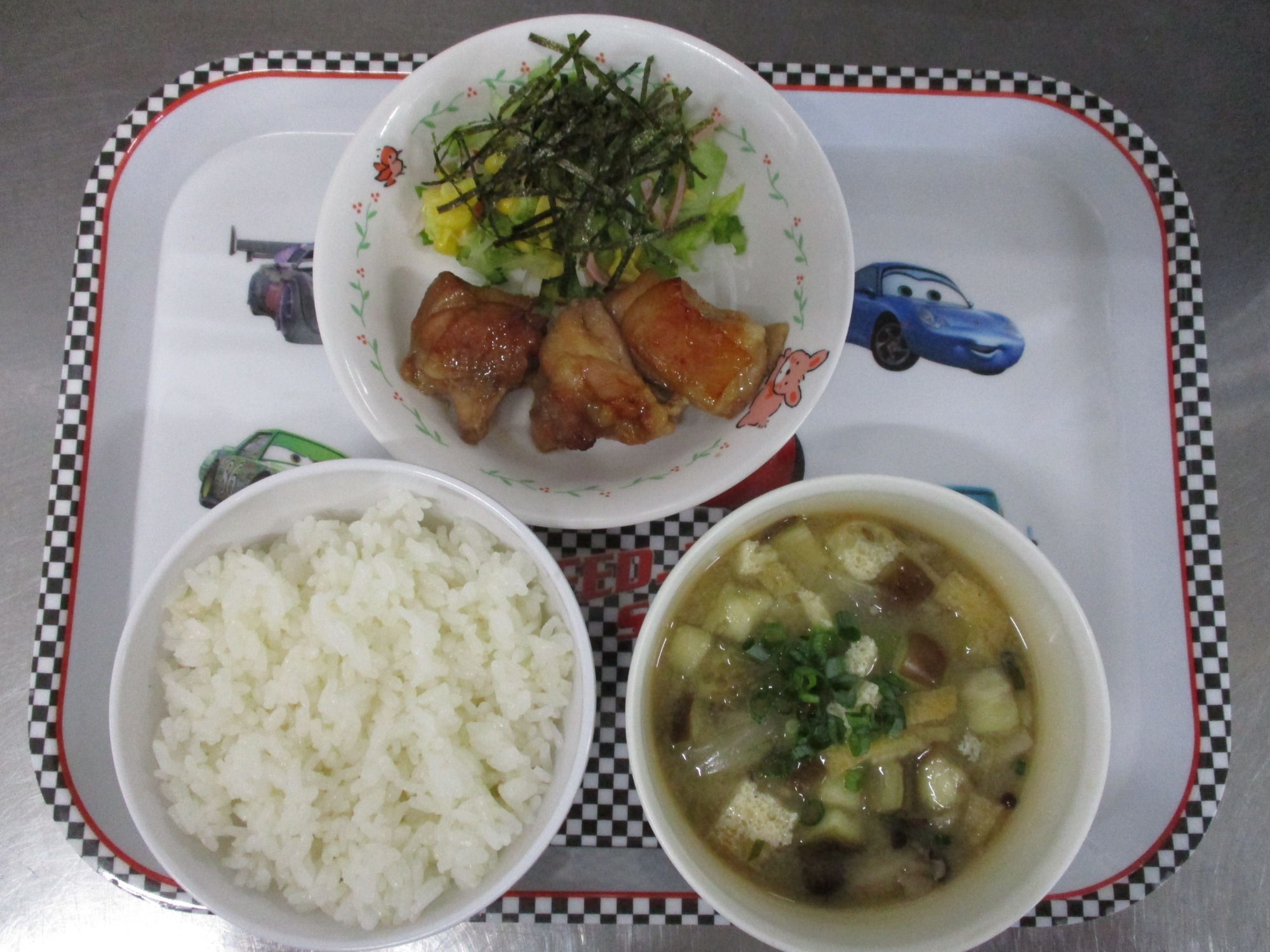 〇ごはん〇とりの照り焼き〇のりとレタスのサラダ〇みそ汁